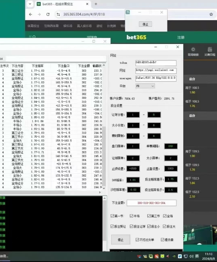 篮球比赛下注,脚本会根据参数设置自动计算,选择比赛,自动下注,胜率百分之75。