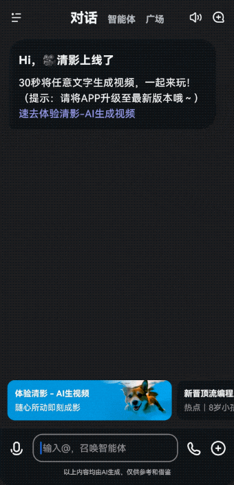 智谱清言App最近升级了其视频通话功能,这被认为是国内首个面向个人用户开放的视频通话功能。