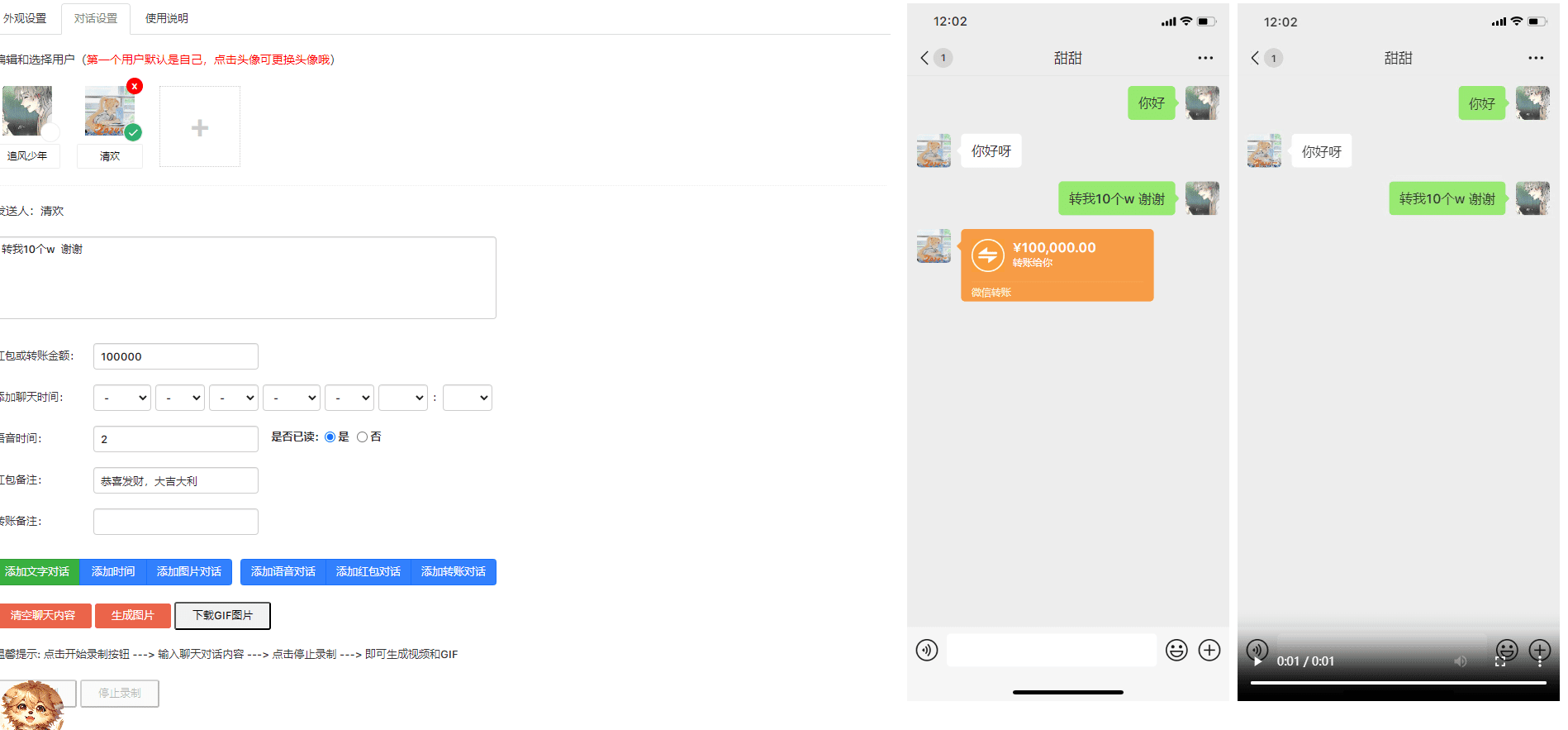 微信对话生成器,是一款聊天对话制作的工具,可以添加不同用户角色进行对话,支持发送文字、语音、图片、红包、转账等