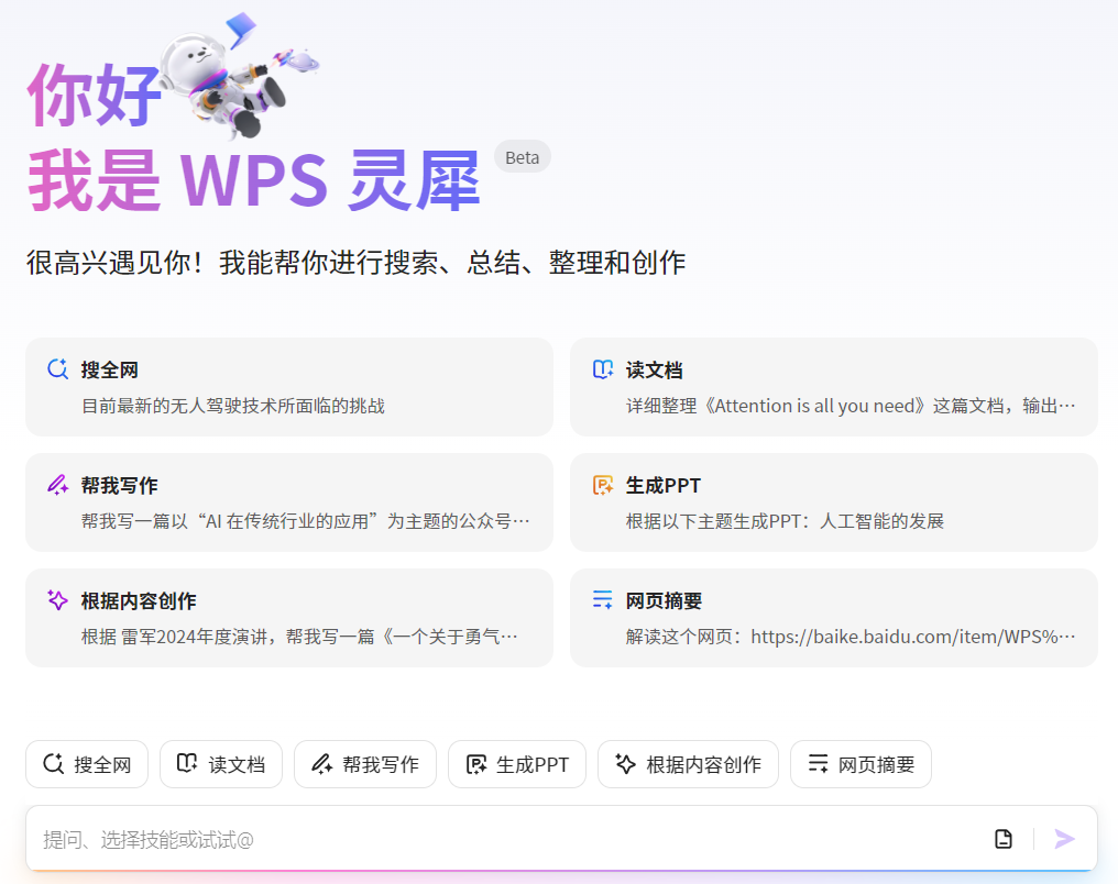 WPS 灵犀(Beta 版)是由 WPS 推出的 AI 智能助手,支持搜全网、读文档、写作、生成 PPT、根据内容创作、网页摘要等常用功能。