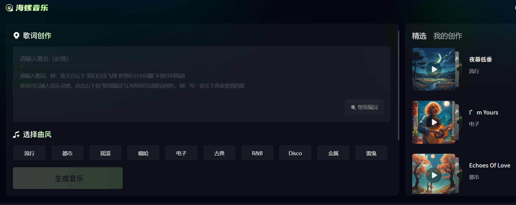 接下来是音乐生成大模型。在这里,你只需输入歌词名称和内容提示词,它就能自动帮你编写一整段的歌词。更令人兴奋的是,你还可以任意选择你想要的曲风,它将直接为你生成一段背景音乐,让你的视频更加生动有趣。