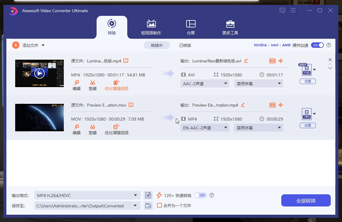 • 一个顶十,支持单个或者是多个视频转换操作,支持GPU加速等