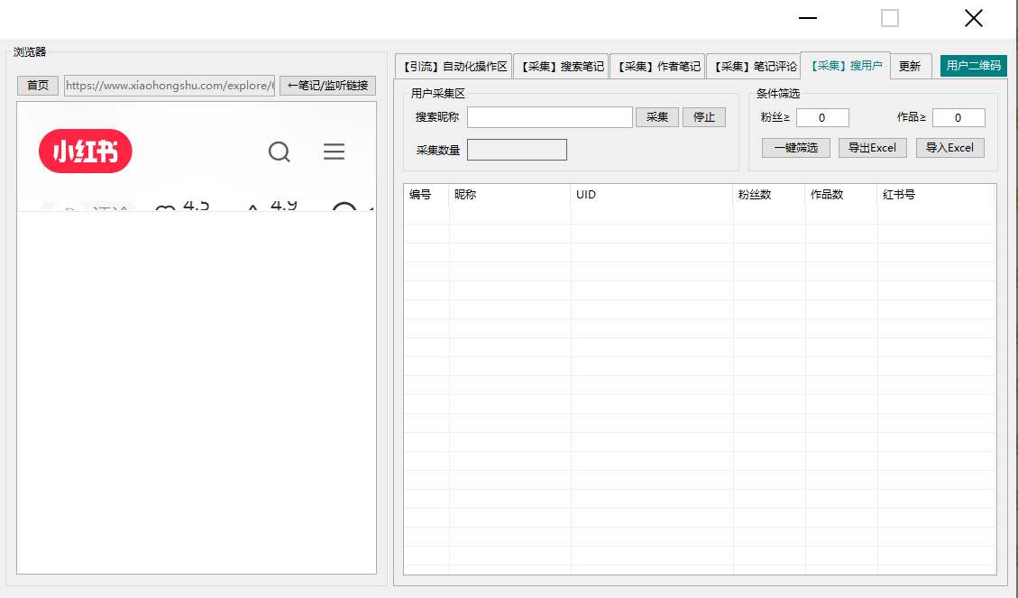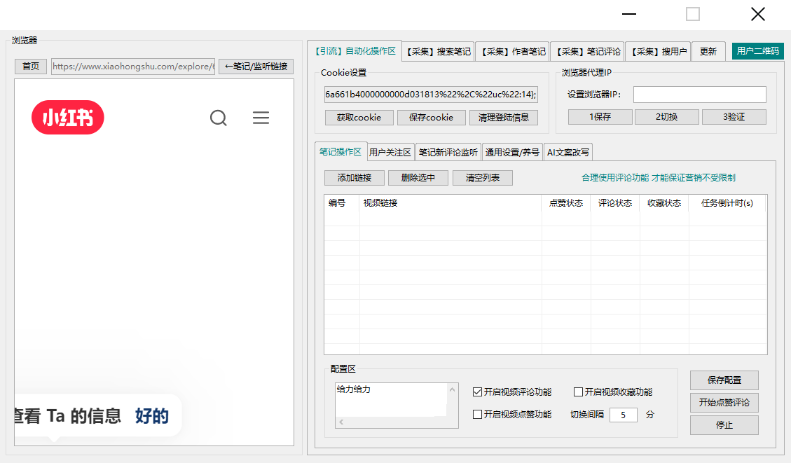 - 【采集】 搜索笔记:根据关键词自动搜索并收集热门笔记,提升流量曝光。
