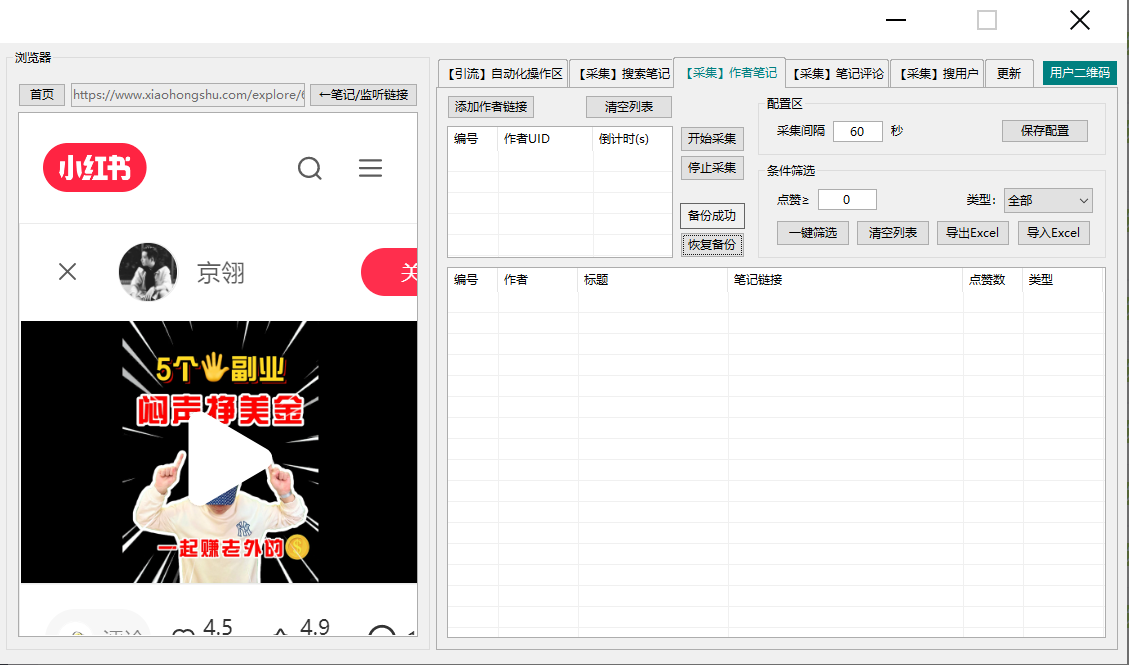 - [采集] 作者笔记:自动采集目标作者发布的笔记内容,锁定潜在流量。