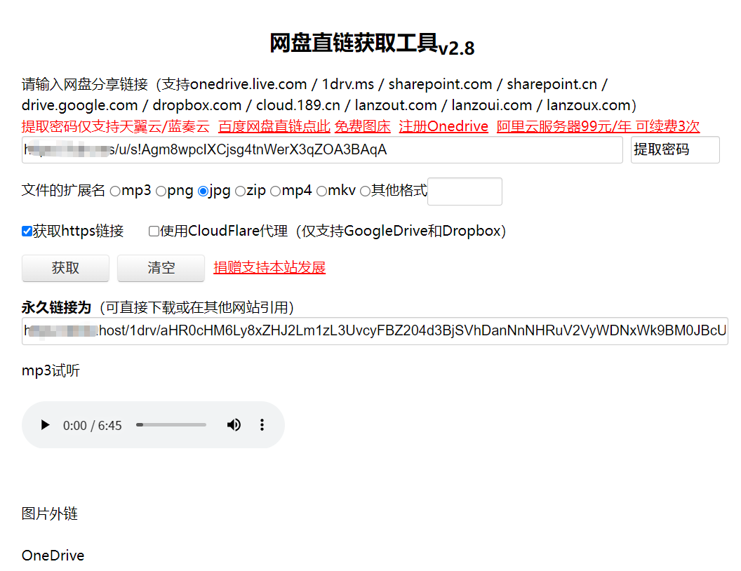 一款网盘直链获取工具,支持支持onedrive/1drv/sharepoint/sharepoint/ drive.google / dropbox / cloud.189 / lanzout / lanzoui等等网盘直链获取,文件的扩展名支持 mp3 png jpg zip mp4 mkv等等,直接粘贴点击获取即可。