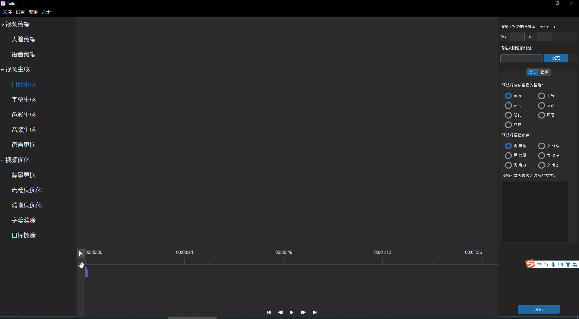 视频生成 口播生成 只需上传一张带有人脸的图像,选择喜欢的语音音色,输入想要生成的文字内容,Tailor 就能瞬间为你生成一个对应语音口型的有声视频。让你的创意轻松实现,打造出独一无二的视频作品! 字幕生成 通过智能识别音视频内容,Tailor 能自动将其转化为文字,并提供多种字体和颜色供你选择。字幕将与视频完美同步,让你的视频更加易懂,更具吸引力。 色彩生成 Tailor 拥有一键式黑白视频上色功能,能让那些陈旧的黑白视频瞬间焕发出绚丽的色彩。仿佛时光倒流,让经典重现生机! 音频生成 该功能可以为静态图和文字赋予生命,将它们转化为生动的视频。静态图将变成视频的图像部分,文字则通过文字转语音技术变成视频的语音部分,让你的创意无限延伸。