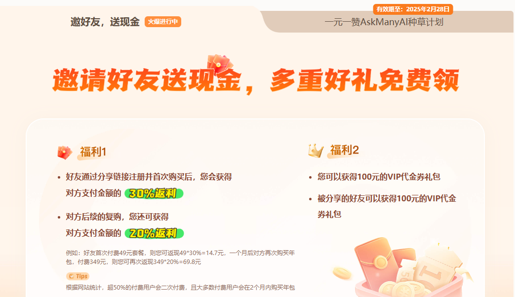 邀请好友返现 🎈:邀请好友加入AskManyAI,双方都能获得现金返现!