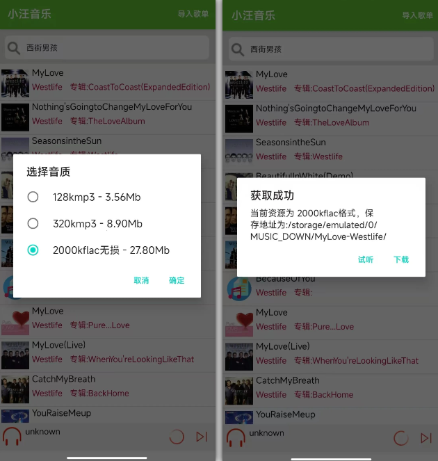搜索后的歌曲可下载无损,如果歌曲没有无损音质,会自动的跳转到其他音质进行下载。