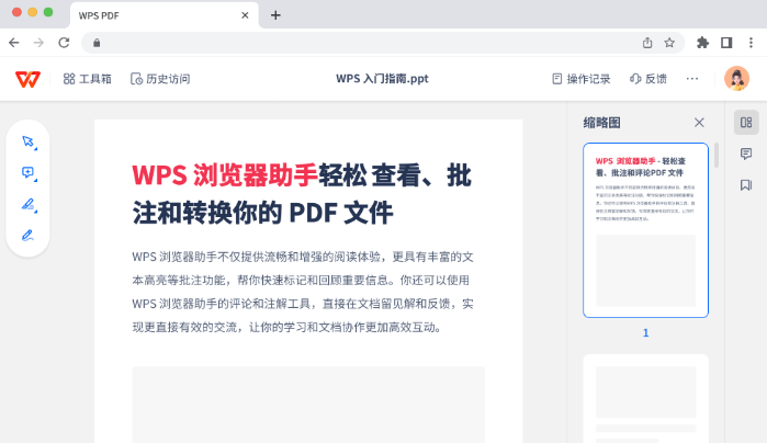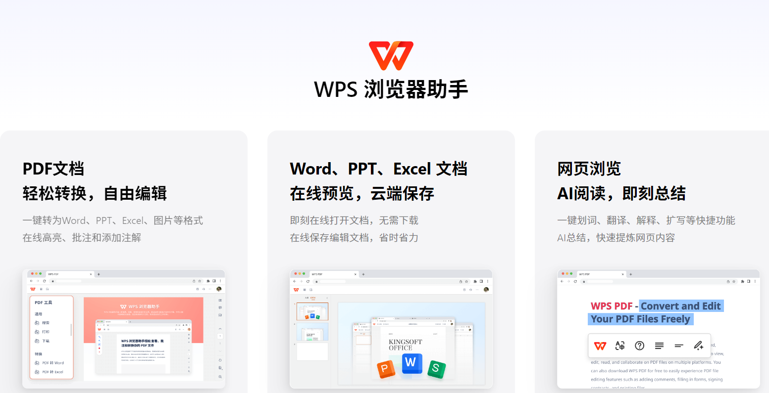 WPS 浏览器助手可以让你在浏览器中轻松查看、编辑、转换PDF,还支持Word、PPT、Excel文档在线浏览、云端保存和编辑。