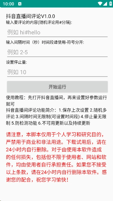 抖音直播间评论功能简介:1.保存上次设置 2.随机多评论 3.间隔时间无限制(可设置时间段) 4.停止量无限制 5.防检测功能 6.所有抖音版本通用