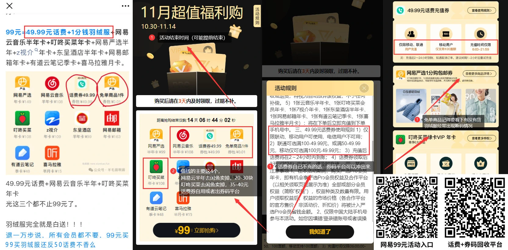 99元=49.99元话费+羽绒服+网易云半年+叮咚年卡+其他一堆VIP。