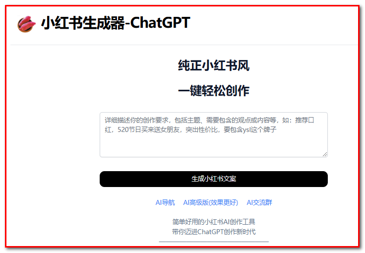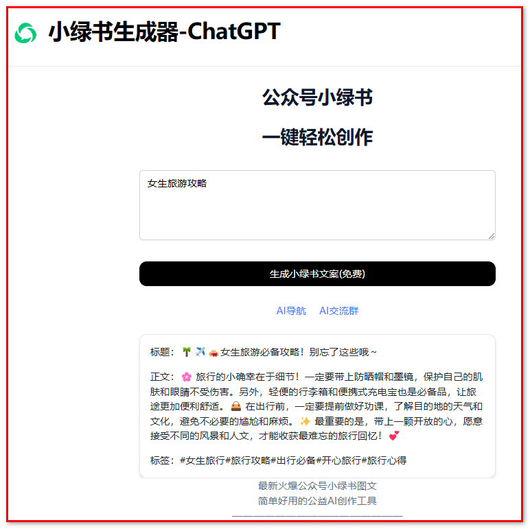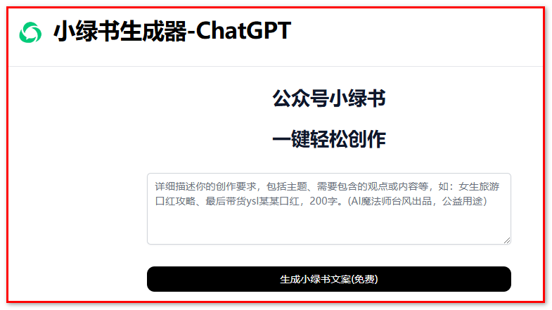 xiaolushu live是一个在线小绿书生成器 ChatGPT,简单好用小红书AI创作工具,只需要简单树木描述,AI即可在线生成小绿书文案。