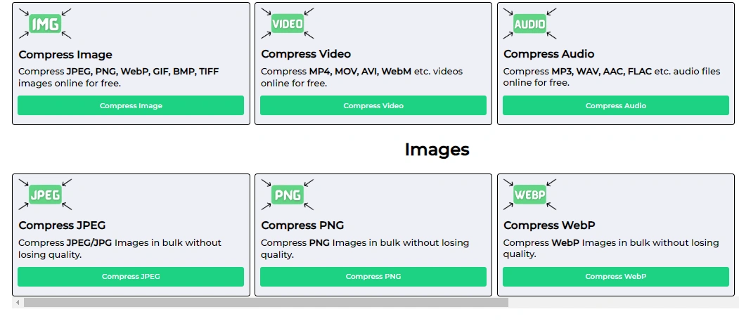 FreeCompress是一个免费在线压缩网站,帮助用户随时随地压缩文件,目前FreeCompress支持图像、视频、音频、文档、代码文件等压缩,免注册登陆即可在线使用压缩工具。