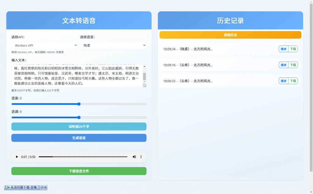 一个在线文字转语音工具,基于两个 API 接口,有几百种声音,支持多语言和国内多种方言,一次最多 3600 个字符,可调整语速和预调,支持试听前 20 字,免费使用,无需注册。现在很多在线配音的都失效了,能有在线的配音工具还是比较少的,此网站音色多,且无需登录,界面美观,还是值得收藏一波的。