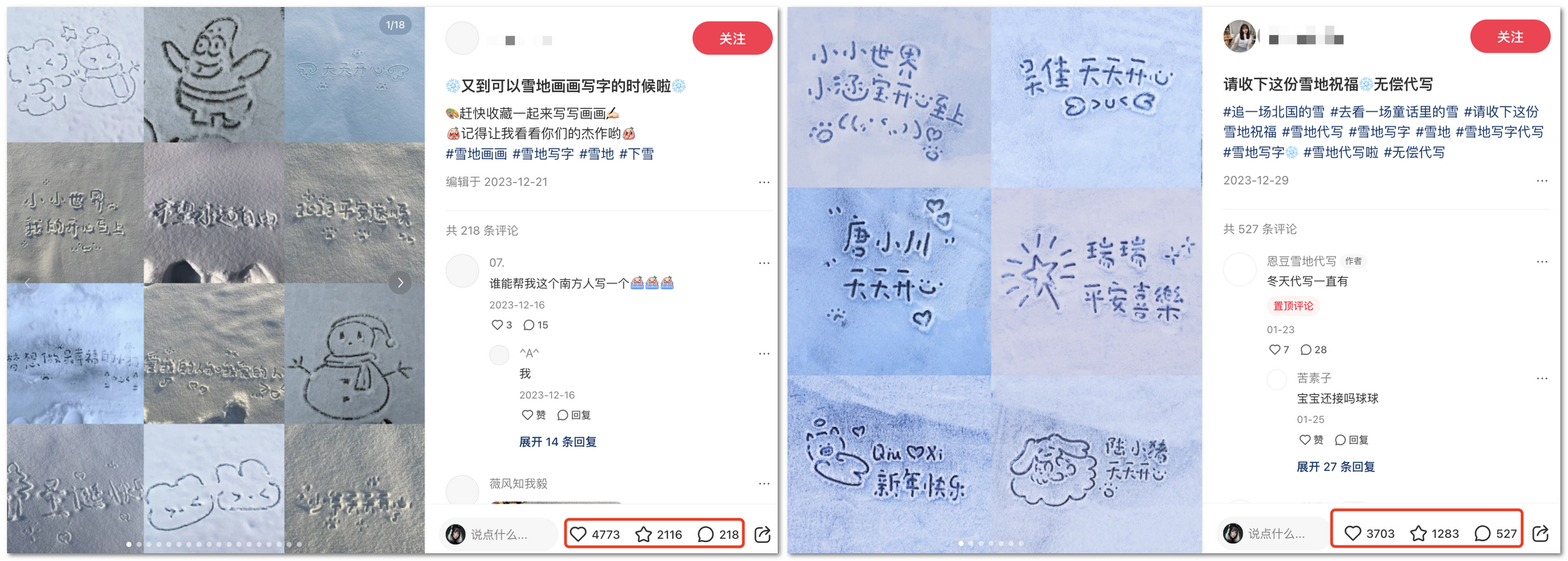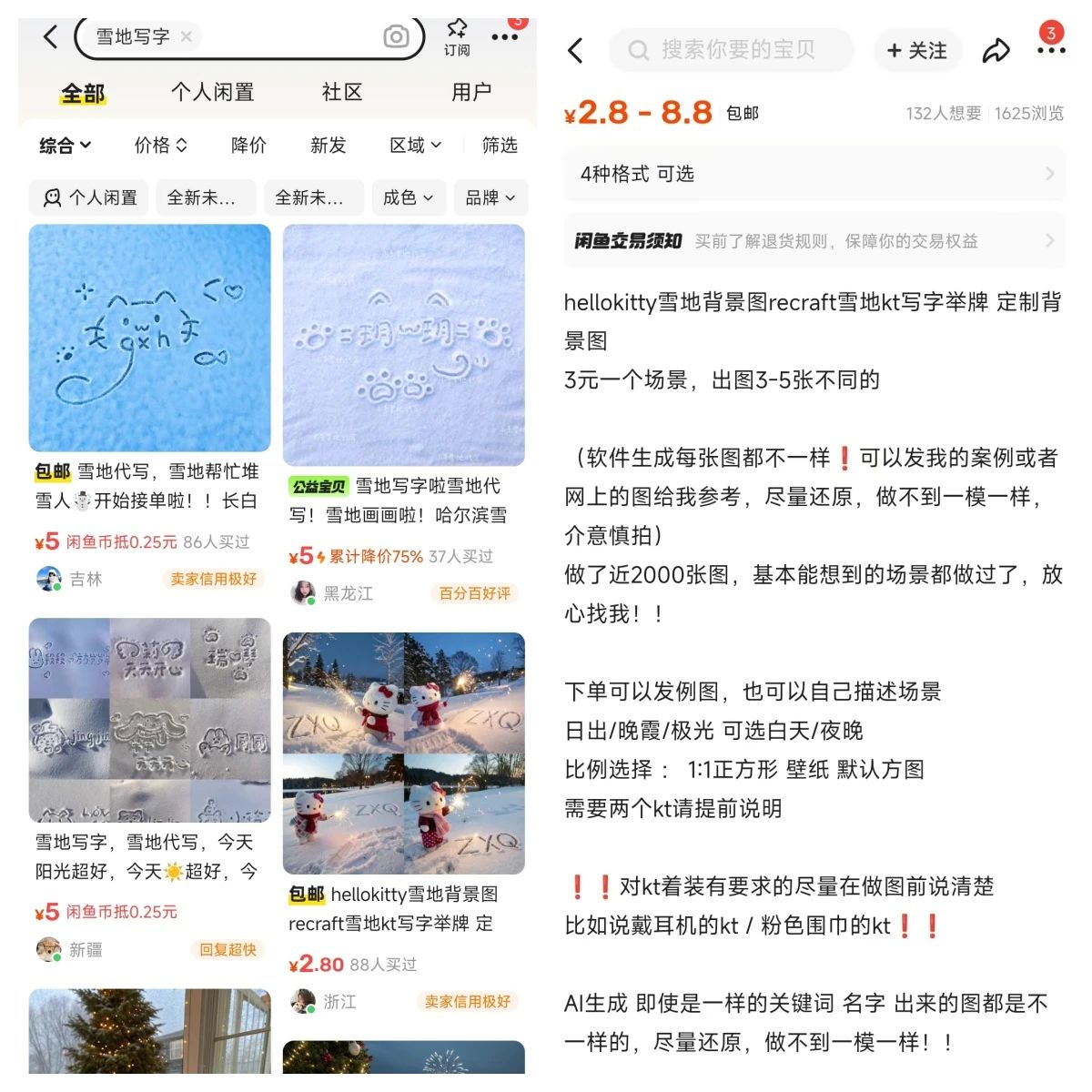 不得不说,无偿代写的确是一个引流的好方式,特别是对于那些一辈子没见过雪又去不了北方的“南方小土豆”来说,无疑是一件非常新鲜好玩的事情。甚至还有人把这门生意搬上了闲鱼,别说,还整挺好。