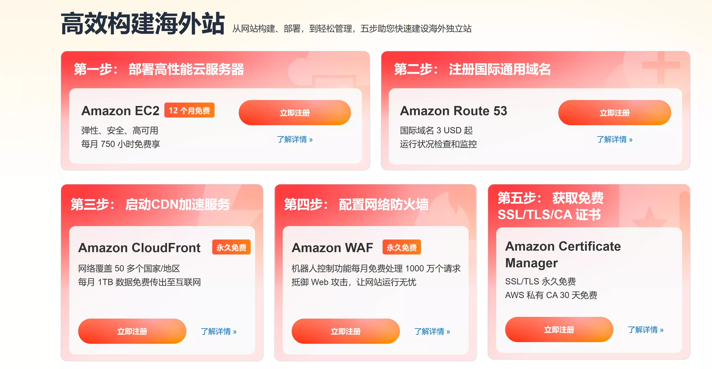 - 支持企业出海的多重福利 亚马逊云推出了多种促销活动,包括免费试用、优惠券以及限时特惠等。同时,提供全球化的解决方案,帮助企业轻松拓展国际市场。