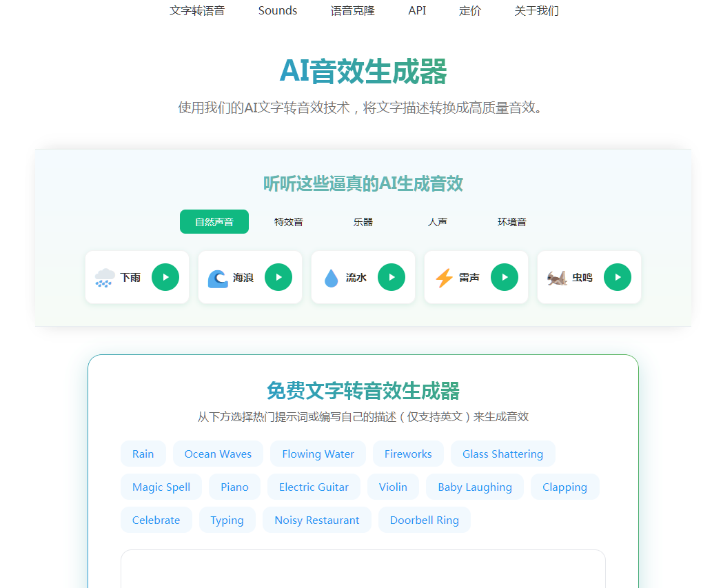 Sounds Effect 的独特之处在于它提供即时定制效果生成,无需传统音频库的繁琐搜索,并且生成的音效是免版税免版权的,可以用于任何项目场合。为了获得最佳效果,用户需要编写包含多层次细节的清晰、具体描述,包括环境、强度、持续时间、频率范围等信息