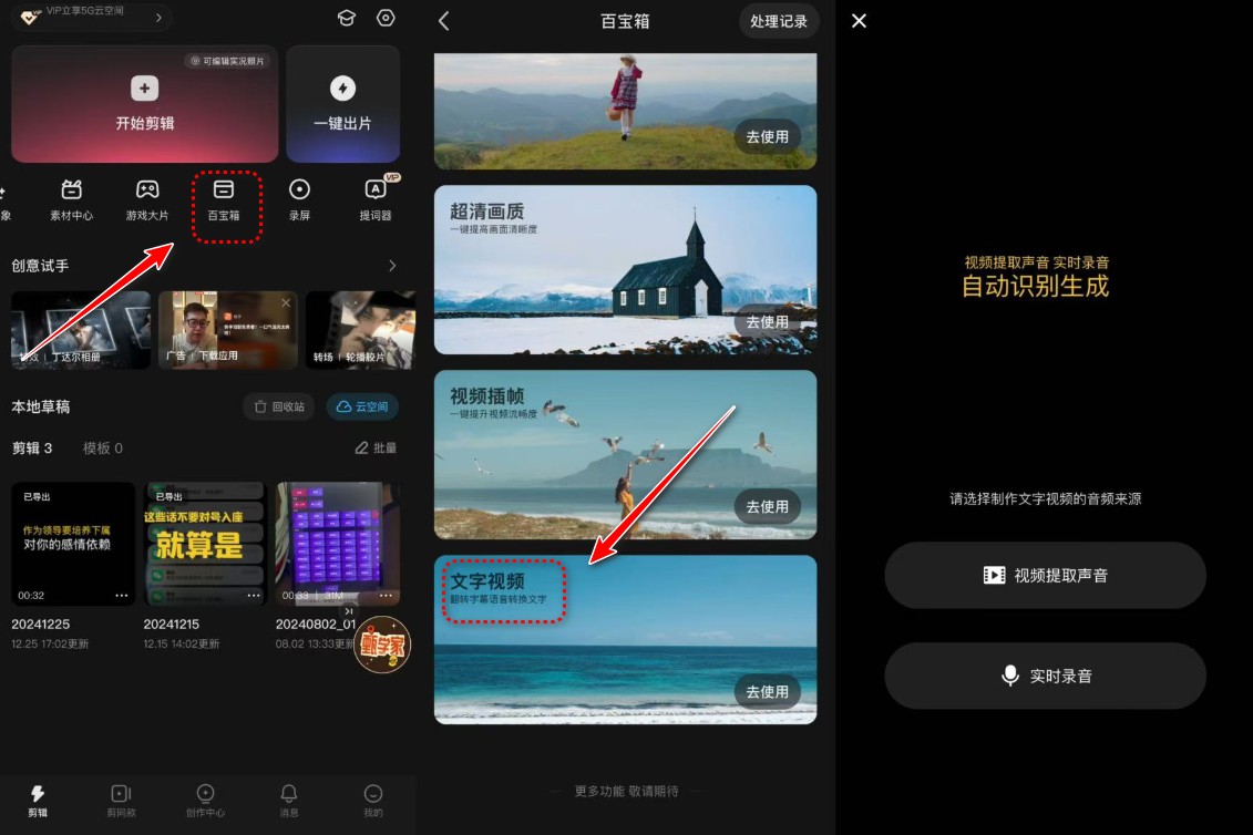 打开快影app—点击百宝箱—滑到最下面找到文字视频并打开