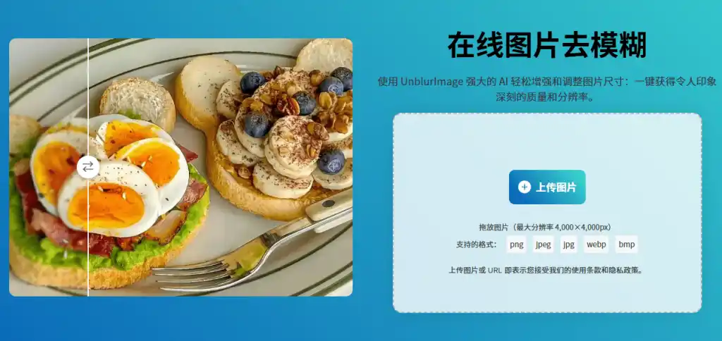 图片放大与清晰增强工具,支持 PNG、JPG、JPEG、WEBP 和 HEIC 等图片格式,最高可上传 4000 × 4000 像素,支持 2 倍 到 4 倍放大,处理过的图片会更加清晰,具有更多的细节,免费无广告,无需注册。