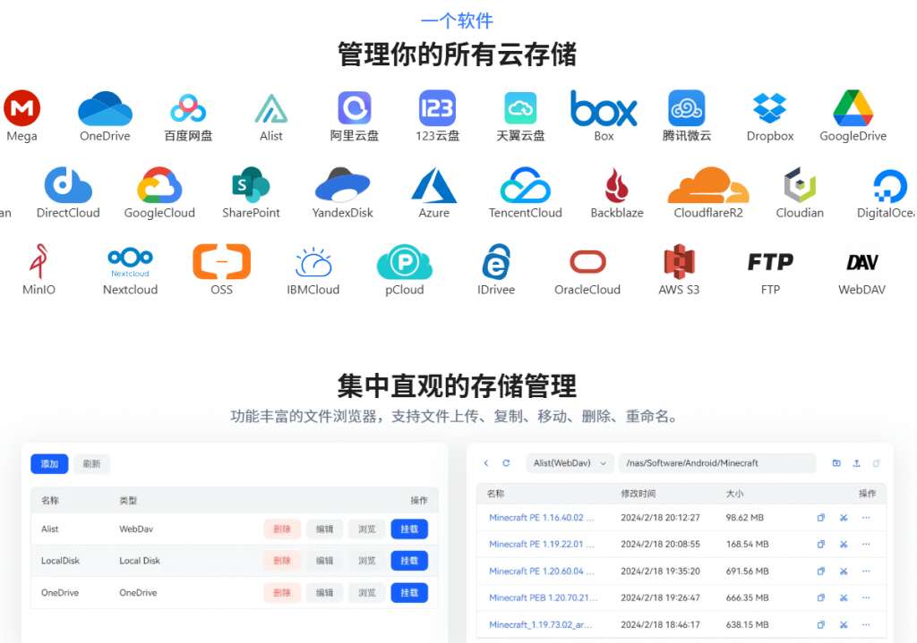 一款统一管理和挂载云存储设施的软件,支持多种云存储服务,包括百度网盘、阿里云盘、Dropbox、Google Drive、OneDrive、AWS S3 、123云盘、移动云盘等,可以在一个界面下统一管理所有云存储账户。使用简单,且免费。支持文件上传、复制、移动、删除和重命名等操作。能够像管理本地磁盘一样管理云端文件。