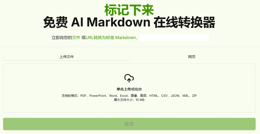 一款功能强大的免费 AI Markdown 在线转换器,支持将多种文件格式(如PDF、PowerPoint、Word、Excel、图像、音频、HTML、CSV、JSON、XML、ZIP 等)快速转换为标准 Markdown 格式,适用于博客写作、技术文档和内容迁移等场景。