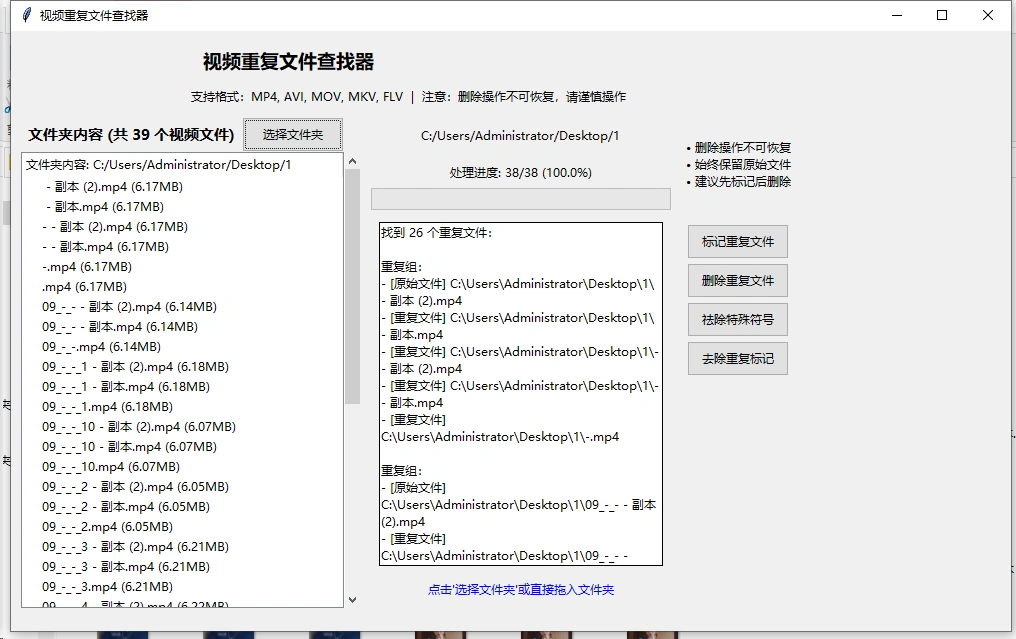 在检测到重复视频文件后,工具会提供详细的列表和预览功能,让您清楚地了解哪些文件是重复的。您可以根据需要选择删除重复文件,或者保留一个版本而删除其他重复项。此外,该工具还支持批量操作,让您能够一次性处理多个重复文件,极大地提高了效率。