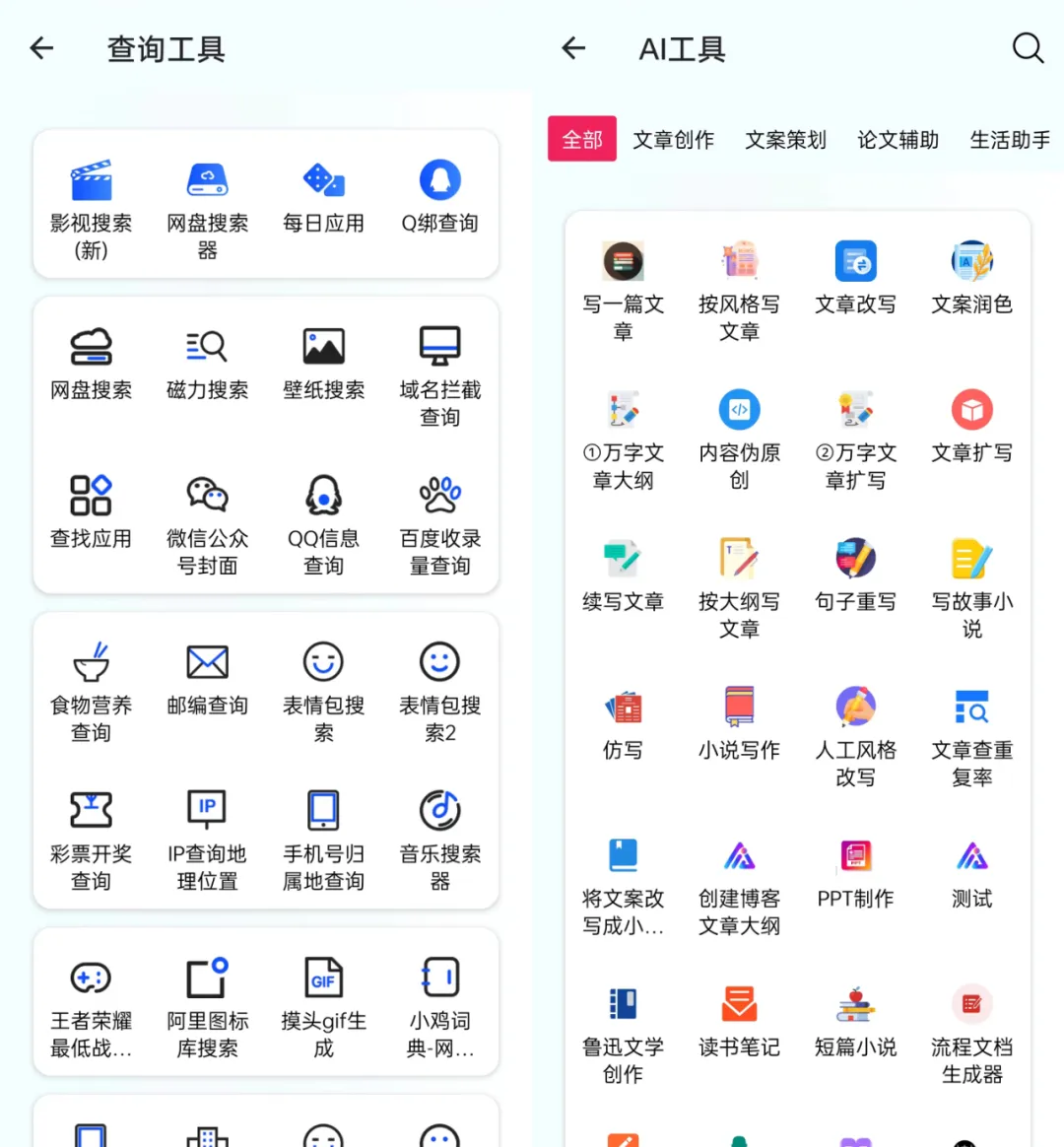 还有软件搜索、网盘搜索、壁纸搜索等,以及各种AI工具。经过实测,绝大部分功能都是可以正常使用的。