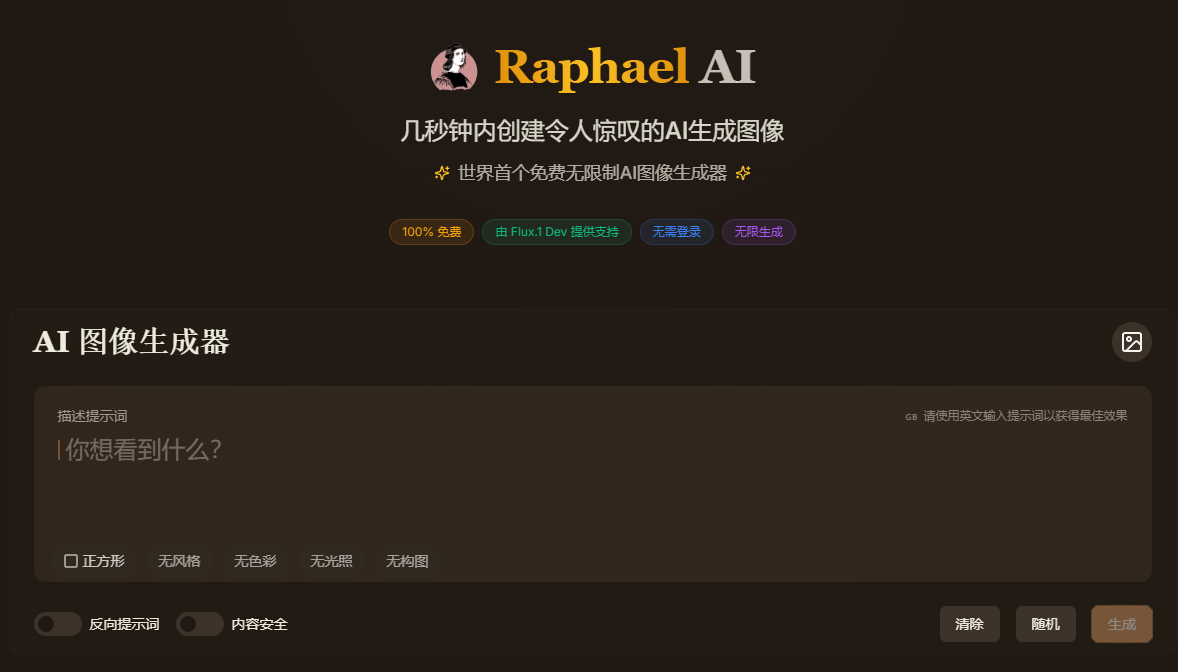 世界上首个无限制的Ai图像生成器,基于 FLUX.1-Dev 模型的 AI 绘画工具,输入提示词即可快速生成图像,支持选择图片比例、风格、色彩、光照和构图,支持负面提示词和内容安全功能,质量感觉还不错,主要是完全免费,无次数限制,无需注册。