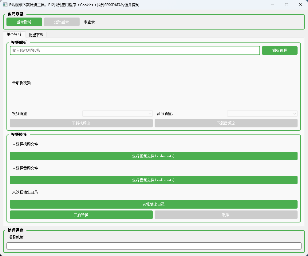 B站视频下载转换工具是一款专为哔哩哔哩(bilibili)平台视频下载设计的工具,旨在帮助用户轻松下载B站视频,并进行视频与音频文件的转换。该工具支持批量下载、视频质量提升以及与FFmpeg的集成,适合需要下载高清视频、转换格式和合并音视频文件的用户。用户只需要进行简单的配置,即可享受高效、便捷的视频下载服务。