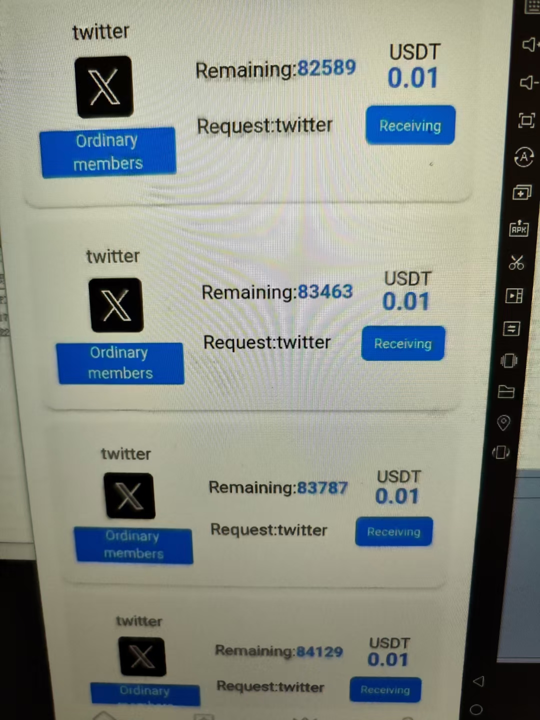 国外推特平台,类似国内抖音,在任务平台接推特博主的任务,给博主刷作品浏览量和粉丝,每个任务0.01U,1U等于7.3元人民币