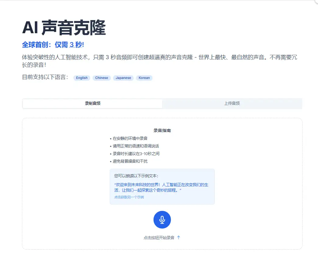 录制声音 —— 使用麦克风录制3秒声音样本,创建你的声音克隆。📱