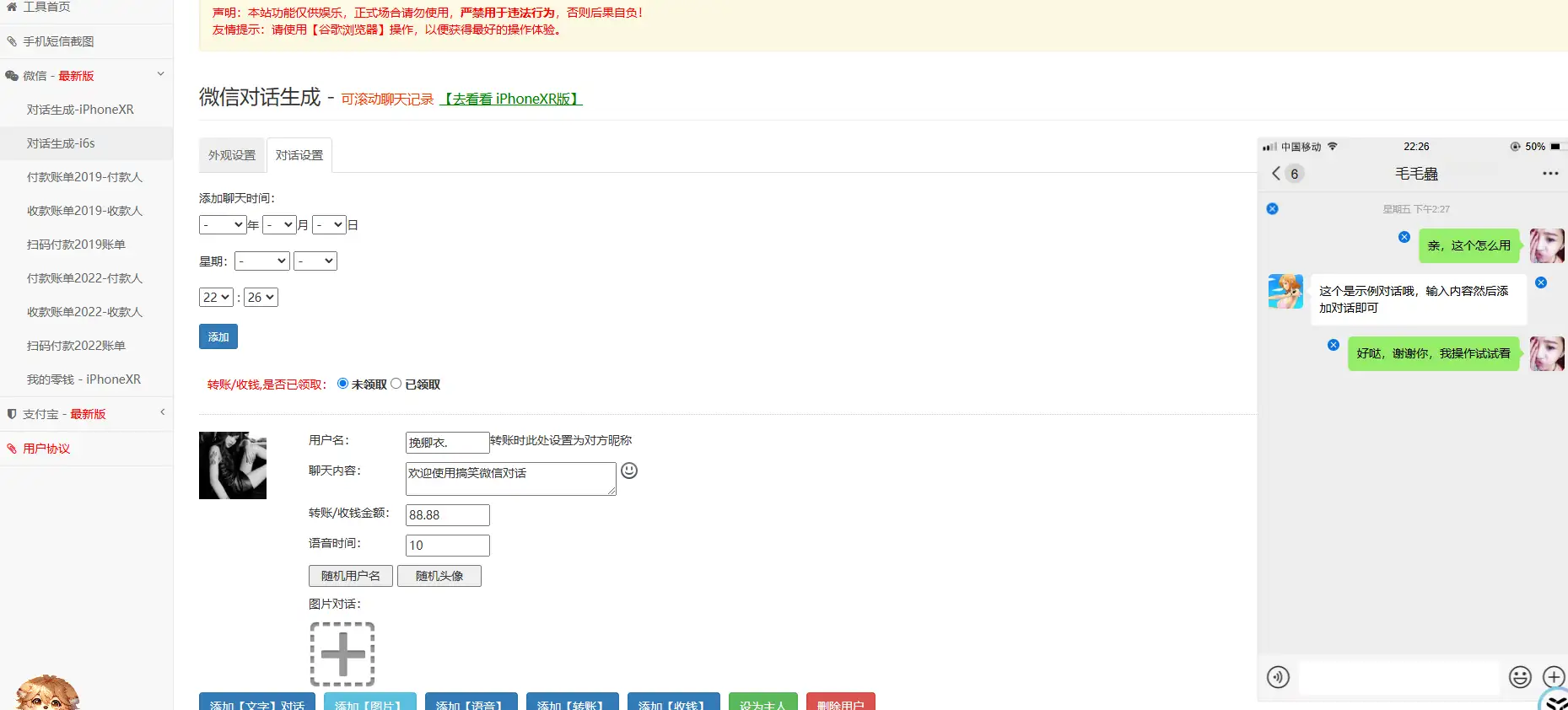 • 🔧 多种类型截图生成:支持微信、支付宝等平台的聊天记录和转账截图生成。