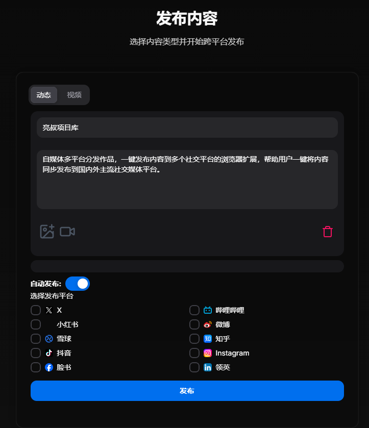 一键发布🔄 —— 只需轻轻一点,内容瞬间同步至国内外主流社交媒体,工作流程大简化!🚀