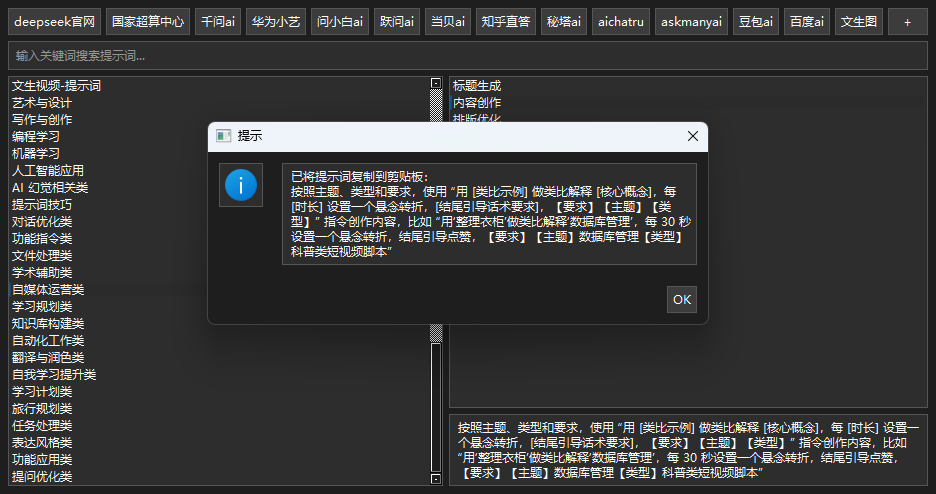 💡 支持用户自定义扩充提示词内容,让你始终掌握最新的AI应用技巧,快速获取各类AI模型使用提示,助力创作无限可能!
