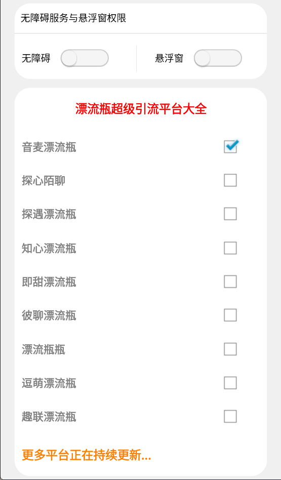 - 🌐 全平台整合:利用9款不同的漂流瓶APP,实现全自动采集和转化,无须手动操作,让你的引流任务自动完成!