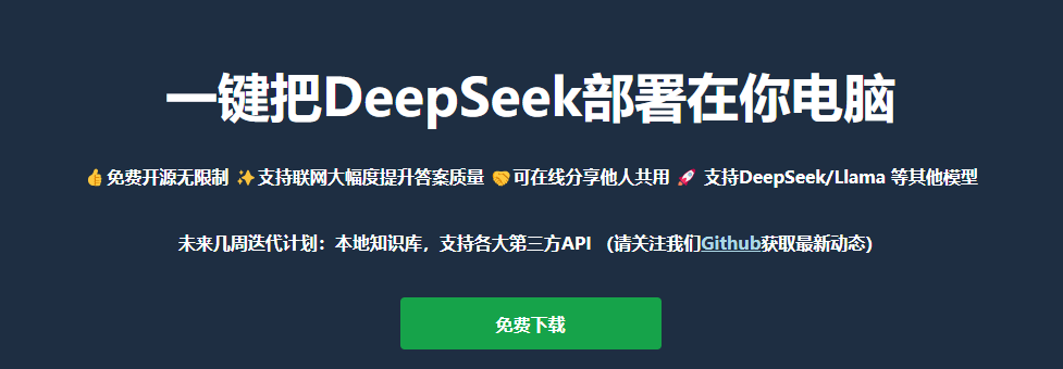 • 🌐 一键部署:仅需一键操作,即可将DeepSeek或其他AI模型(如Llama)部署到你的电脑上,实现本地化、可共享的智能服务。