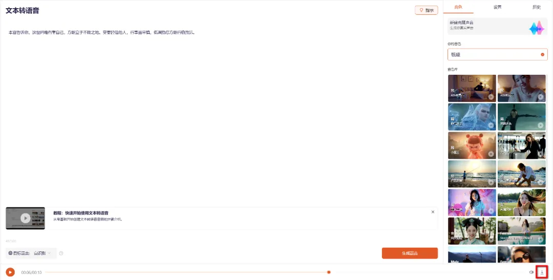 🌈 网站自带丰富的音色库,如ASMR男声、ASMR女声、帅气龙王、邪恶老头、美妆主播、台湾女神等,满足各种创作需求。