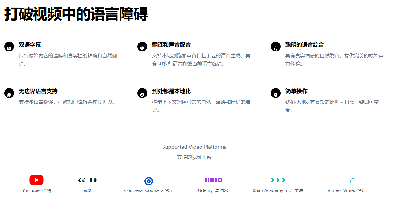 • 🌐 支持YouTube、Coursera、edX、Udemy、Khan Academy、Vimeo等多种视频平台,无论在哪里观看视频,都能享受AITransDub的便捷服务。