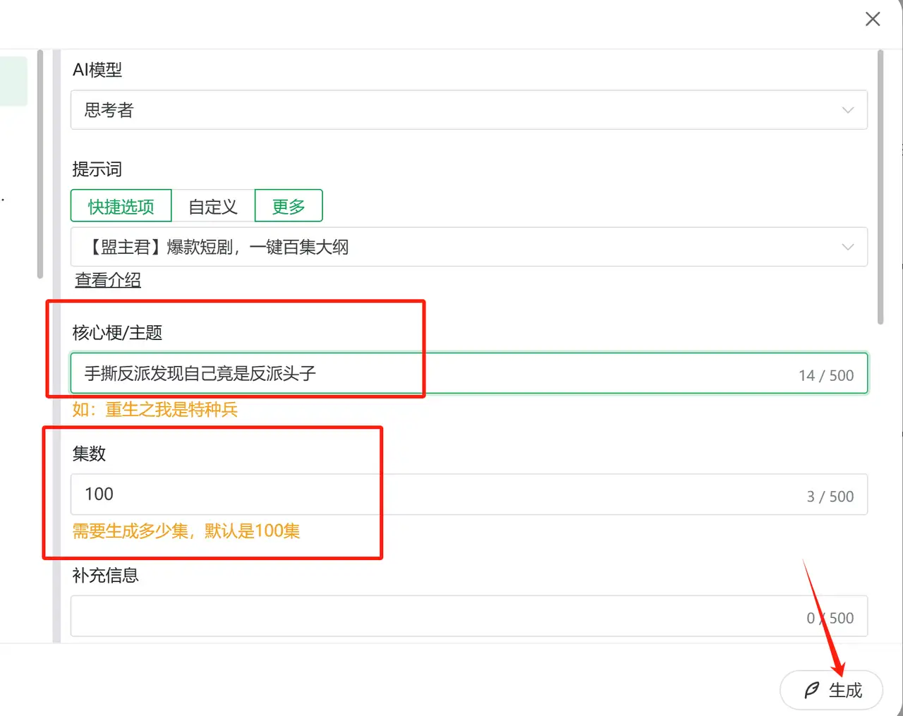 🔍输入主题和关键词:根据你的创意火花,输入短剧的主题和关键词,如“校园爱情”💑、“职场奋斗”💼、“悬疑推理”🔍等。