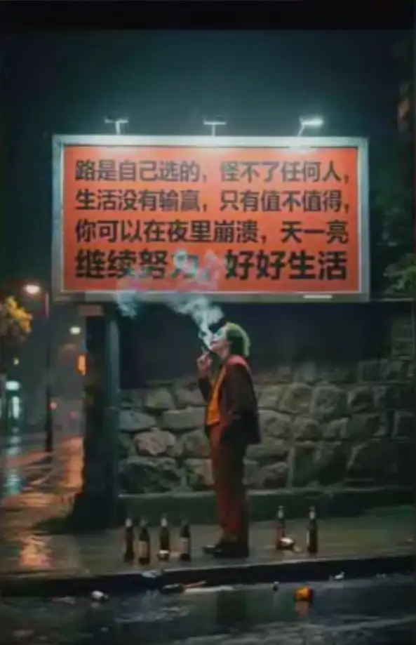 - 场景化配图:利用AI生成“办公室加班场景 + 小丑剪影”等配图,强化文案的代入感,让观众更有身临其境的感觉。