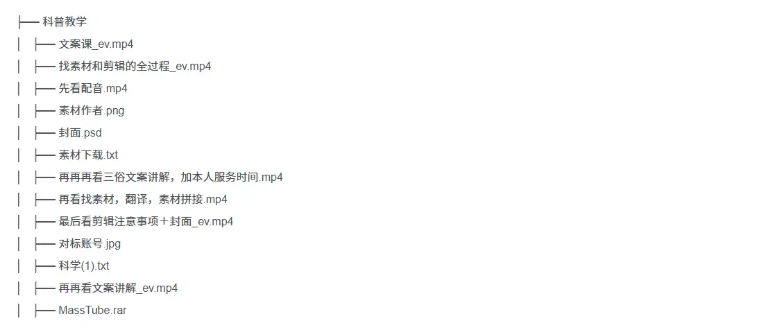 课程还配备了丰富的教学资料,如文案课_ev.mp4、找素材和剪辑的全过程_ev.mp4、先看配音.mp4等视频教程,以及素材作者.png、-封面.psd、素材下载.txt等素材文件,方便创作者学习和实践。