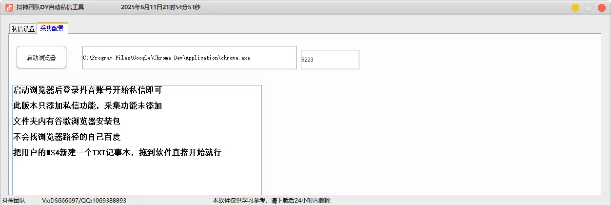 这款工具操作十分简便。你只需登录抖音账号,即可开始使用私信功能。值得注意的是,此版本仅添加了私信功能,采集功能并未包含在内。同时,在文件夹内还贴心地准备了谷歌浏览器安装包,方便你使用。如果你不清楚如何找到浏览器路径,可以通过百度自行查询。