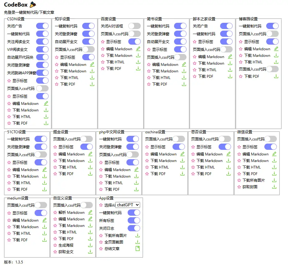 这款插件功能强大,适用于CSDN、知乎、脚本之家、博客园、51CTO博客、php中文网、掘金、微信等众多网站。它支持一键下载文章成html或markdown文件,让我们能够方便地保存和整理所需内容。在代码复制方面,它实现了无需登录一键复制,无论是选中代码,还是点击代码右上角的按钮,都能轻松完成复制操作。