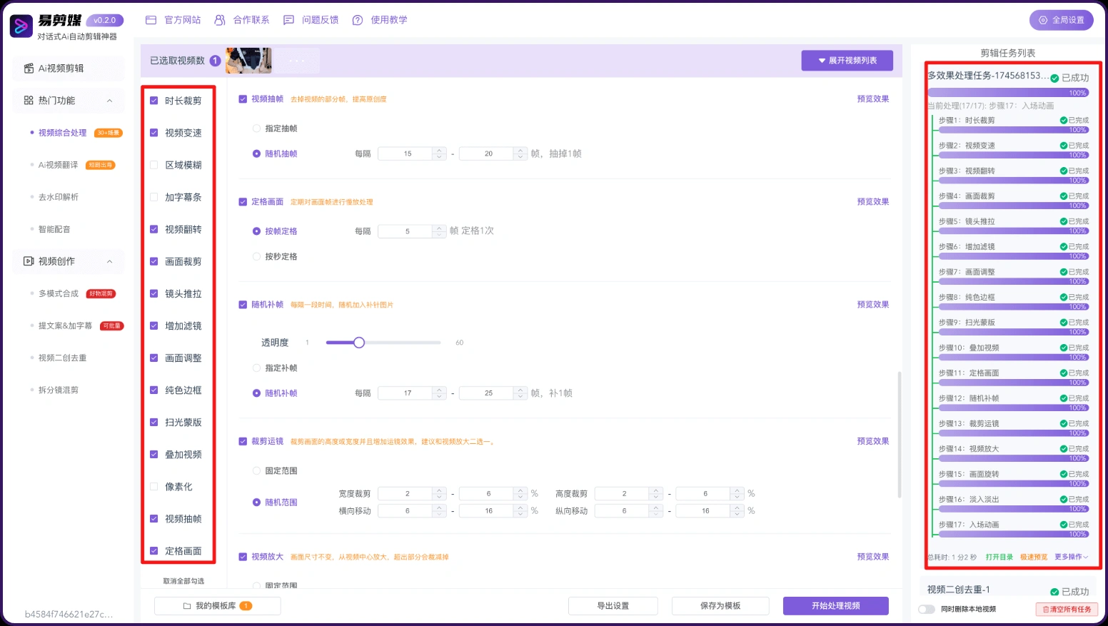 该软件功能强大,亮点颇多。在视频处理方面,它支持批量视频处理任务,并且能够实现多线程并行处理,大大提高了工作效率。新增的视频综合处理功能,提供了 30 + 种自动处理方案,不仅支持批量操作,还能充分利用 GPU 资源,让视频处理更加流畅高效。
