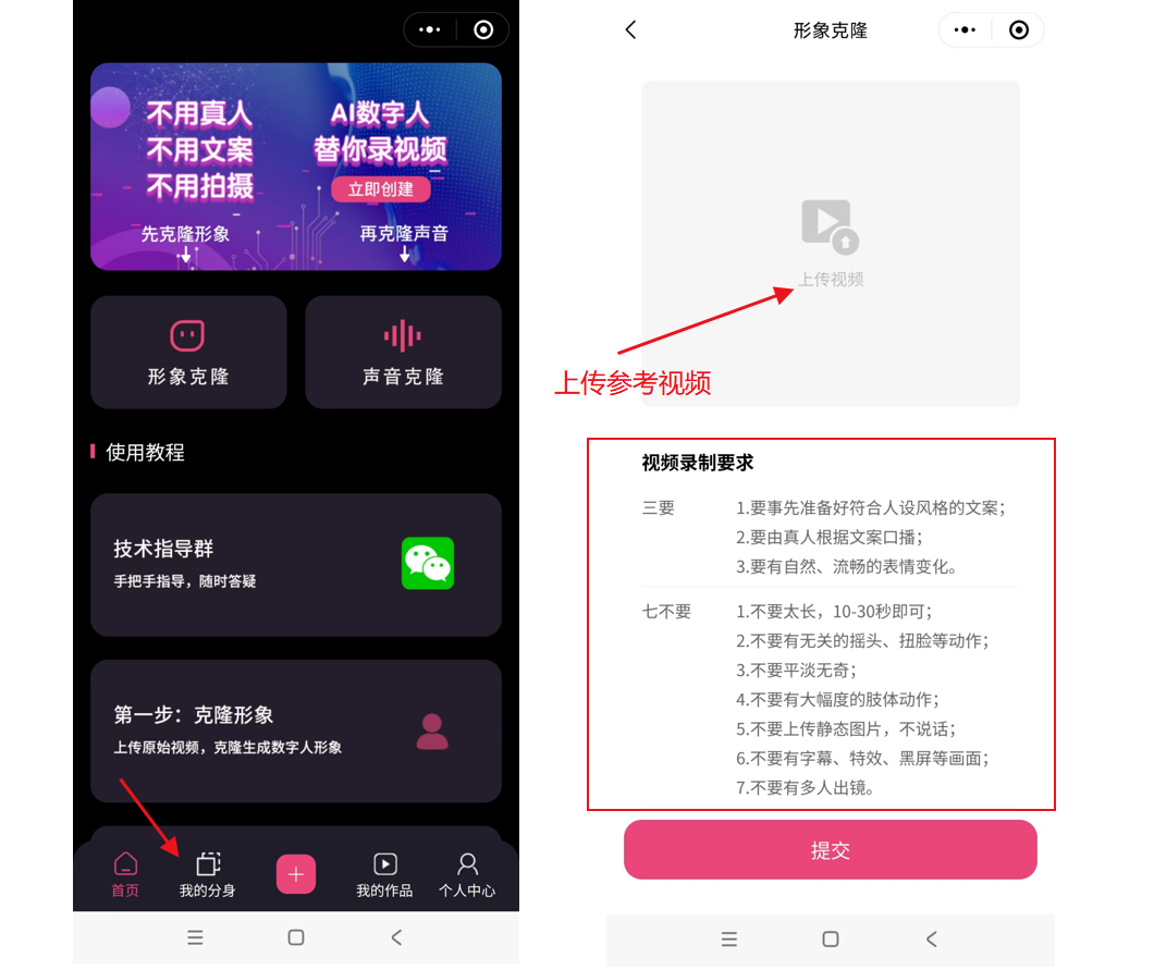 使用“魔镜数字人”十分便捷。扫描下方二维码注册即可获得 1000 积分。注册登录后,按照提示创建你的“数字分身”:拍摄一段小视频完成“刷脸”认证,录制一段声音留下独特声线,你的数字分身就正式“出道”了。制作视频时,只需点击中间下方的加号,选择你的数字分身,输入文字让 AI 配音,或者直接上传录制好的音频,提交后稍等片刻,一杯奶茶的时间,视频就新鲜出炉了。