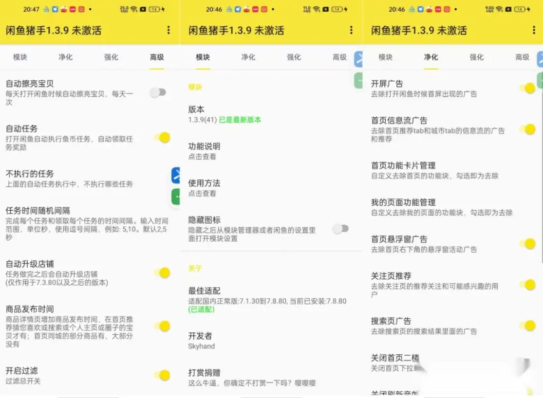 总结:安卓用户使用闲鱼时,闲鱼猪手这款辅助工具绝对值得拥有。它不仅能净化界面、去除广告,还具备自动签到、收鱼、兑换鱼币、擦亮宝贝等实用功能,支持自定义快捷问题,适配多个闲鱼版本,按照特定步骤安装激活后,就能帮你轻松自动获取闲鱼币,大幅提升交易效率。