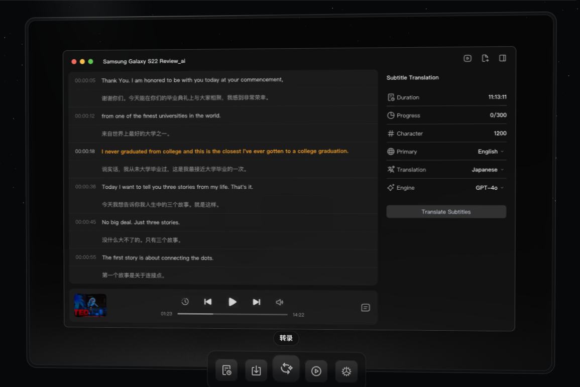 对于字幕编辑与翻译需求,Grabcube同样表现出色。它支持本地字幕编辑和AI翻译,让您能够轻松自定义视频观看体验。编辑后的字幕可以导出并在其他视频播放器或编辑软件中使用,而翻译后的字幕则可以实时校对,通过双语播放器,让您更好地理解视听内容。此外,Grabcube还提供了多种主流AI翻译引擎供您选择,确保翻译结果的准确性和流畅性。