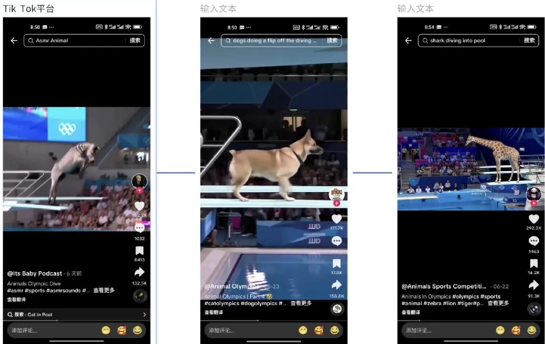 近期,一种别开生面的动物奥运会跳水视频在短视频平台掀起热潮。视频中,小猫、小狗、大象、北极熊等萌态可掬的小动物们,纷纷从10米跳台纵身跃入游泳池,在空中完成几圈精彩的翻转动作。这种视频以其强烈的反差感吸引了大量观众——我们习惯了看人类运动员在跳台上优雅地旋转后空翻,而AI技术却巧妙地将人物替换成了各种小动物,创造出令人捧腹又新奇有趣的视觉效果。无论是在抖音还是TikTok等平台上,这类视频都备受追捧,动辄收获数百万点赞,成为当下短视频领域的热门话题。
