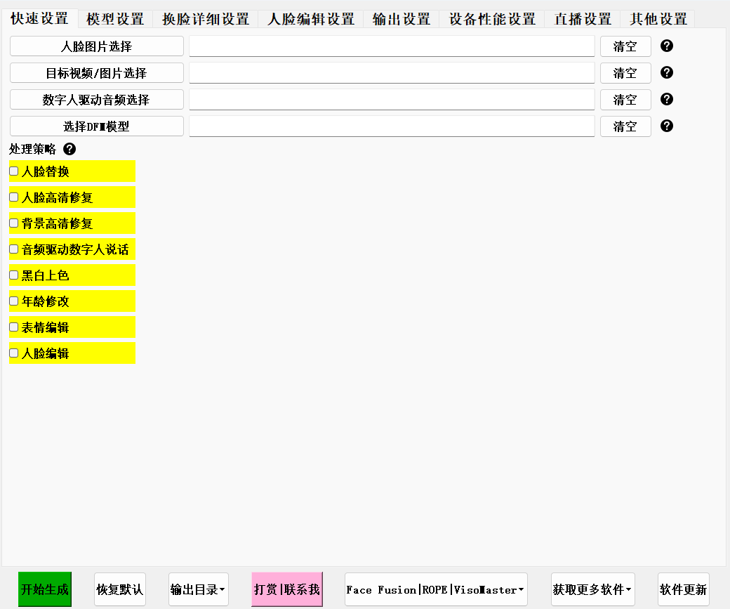 该工具基于开源项目rope、facefusion整合优化而成,拥有中文界面,操作简便易懂。只需设置好人脸图片和目标视频/图片,即可一键开启换脸之旅。特别提醒,在选择人脸或目标素材时,请确保素材文件名不包含中文,以避免报错情况发生。