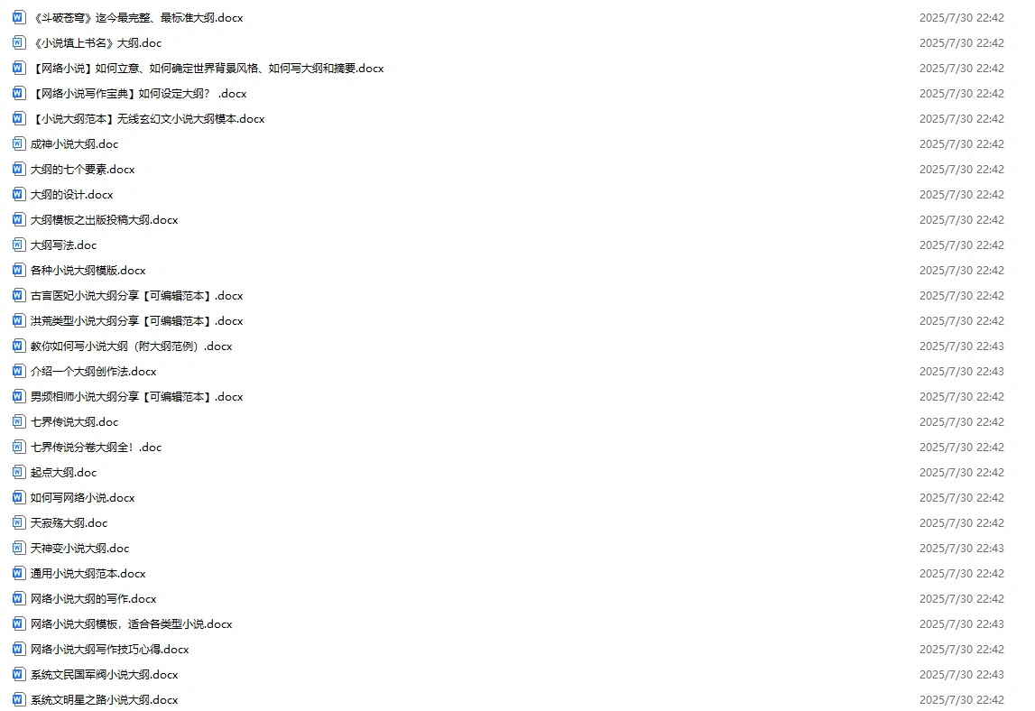 对于广大网络小说创作者而言,拥有一套完善且灵活的小说大纲模板以及丰富的素材合集,无疑是提升创作效率与作品质量的关键。今天,我们特别为网站用户准备了一份AI网络小说大纲模板与各种素材的合集,旨在助力每一位小说创作者轻松驾驭各类型小说的创作。